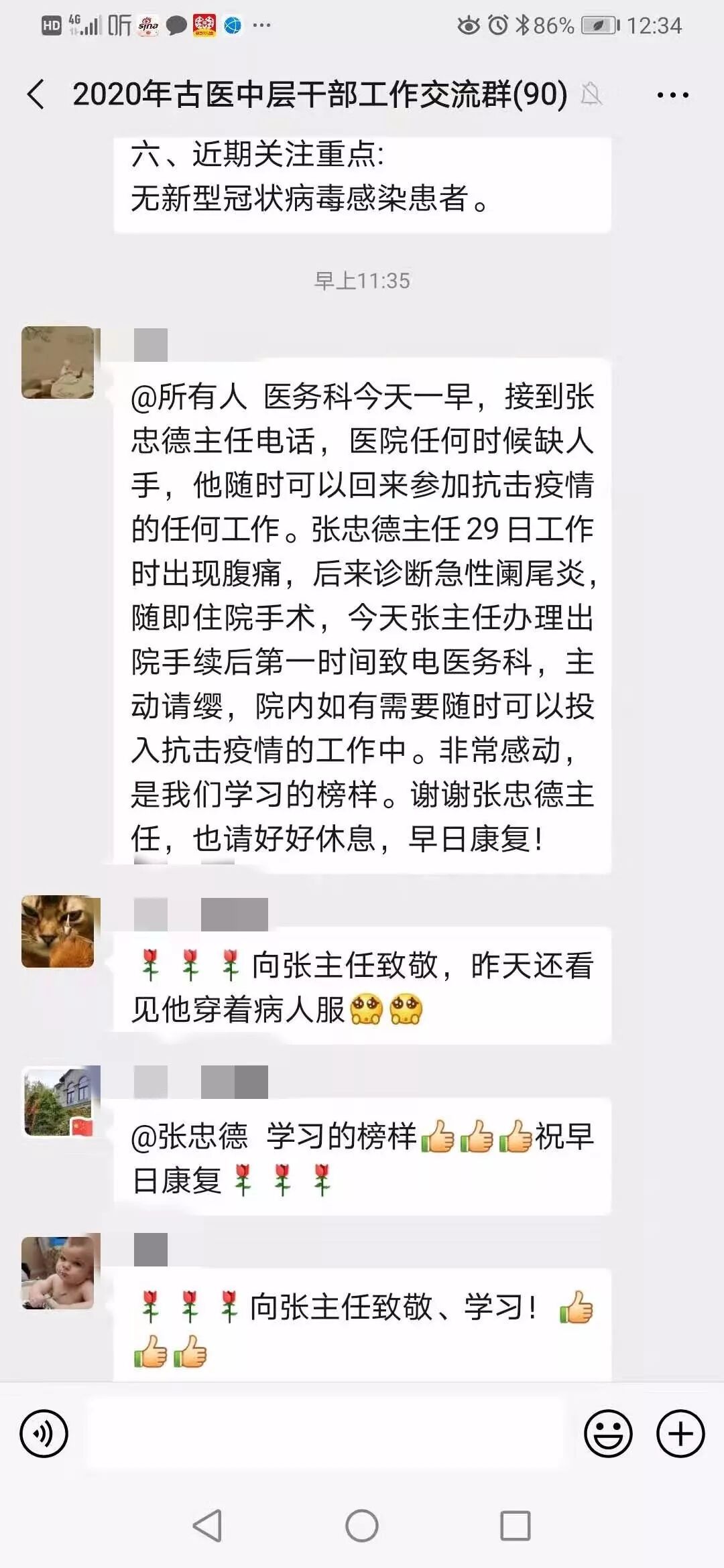 我院超声科张忠德主任在1月29日因急性化脓性阑尾炎住院手术,今天是术后第4天,出院手续还没办,一大清早他就迫不及待的致电医务科,表示医院任何时候缺人手,他随时可以回来参加抗击疫情的任何工作。