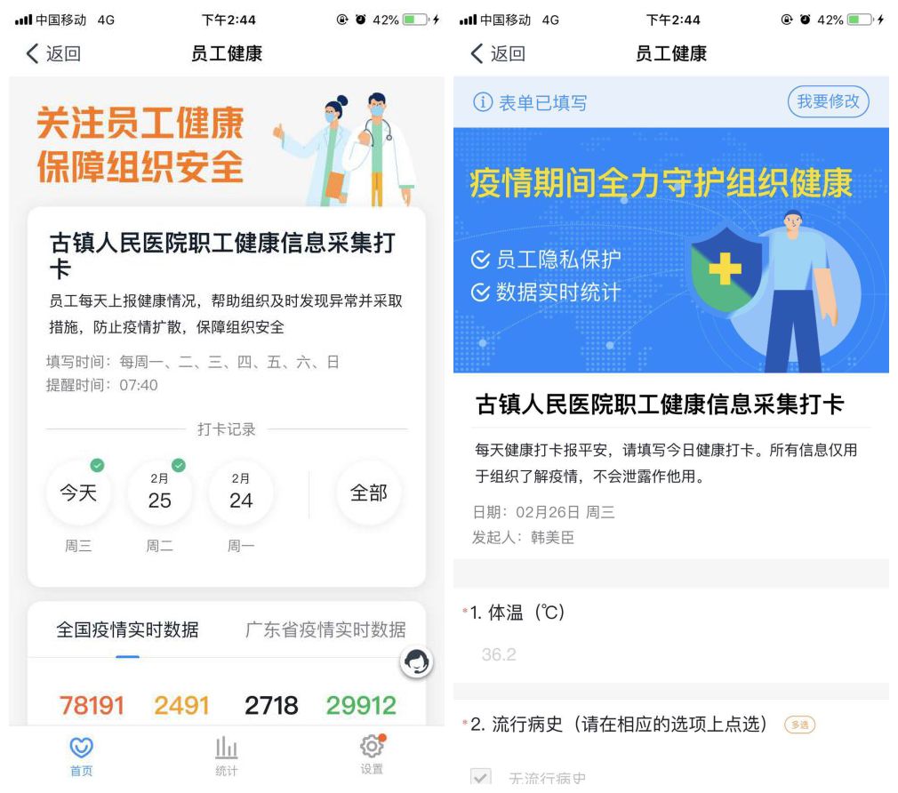 同时,为进一步加强疫情防控期间医院人员的防护工作,保障医务人员健康,我院严格落实感染防控各项要求,加强医务人员健康监测。为了使监测有效、高效,减少上班高峰期大门的人员聚集,我院成立了职工健康驿站打卡点,利用手机应用实现“现场测温,网络打卡”,以便更好地掌握医院职工的健康问题。