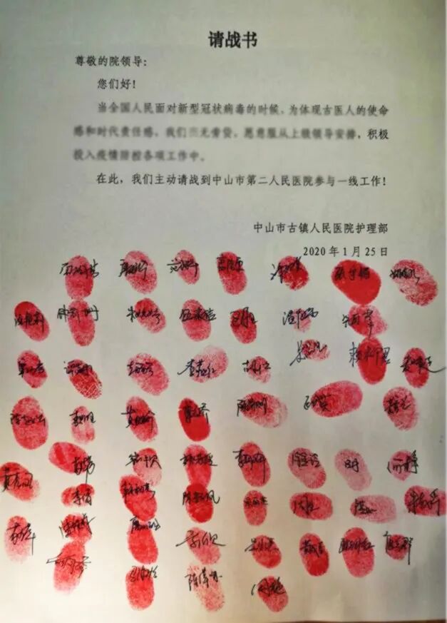1月25日,以中山市古镇人民医院护理部曾玲芳主任为首的全体护士主动放弃春节假休,请缨出征风险最大、危险最高的地方。中山市古镇人民医院全体护士请战书!