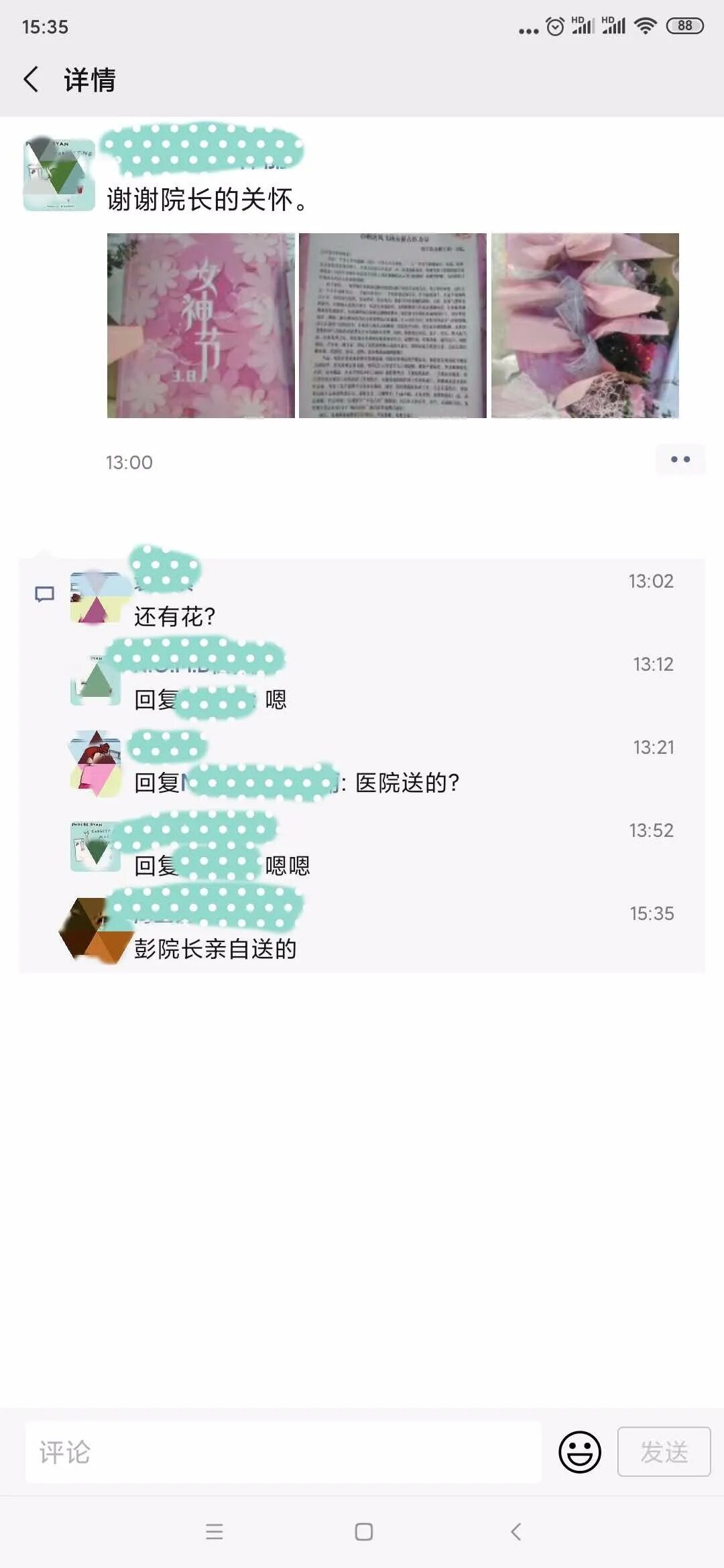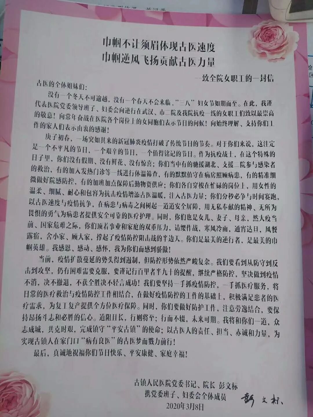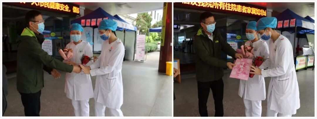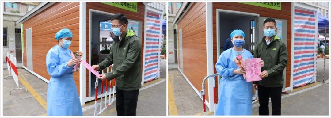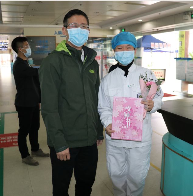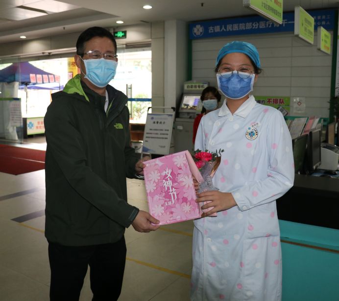女神节,院长亲自把特别的“告白”送给抗疫一线的她们 发布时间:2020/04/17 浏览次数: 次 【字体:小 大】 巾帼不让须眉体现古医速度,巾帼逆风飞扬贡献古医力量。 在同心抗疫的非常时期,第110个三八国际劳动妇女节如约而至。 3月8日上午,院党委书记、院长彭文标在院妇委会班子成员的陪同下,把精心准备的节日贺卡和鲜花亲手送给我院抗疫一线的女战士们。 芬芳三月,巾帼如歌。 举国上下,众志成城。 真诚地祝福女战士们, 节日快乐、平安康健、家庭幸福! 分享到: 【打印正文】
