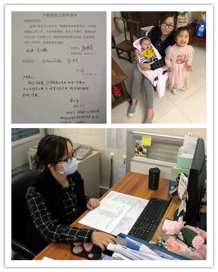 战疫打响时,陈艳芬同志正在休产假,她时刻关注着疫情的进展,得知同事们从年三十以来一直都没有休息,看到群里徐主任照片的黑眼圈和布满血丝的双眼,毅然做了个决定......写下申请书,提前结束休假,回到工作岗位上和同事们共同抗疫。她的爱人也是一名医务工作者,得知艳芬的想法后,也非常理解和支持妻子的决定。
