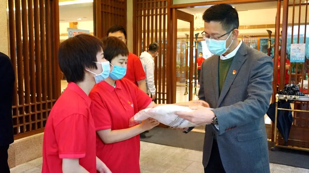 彭文标院长从吴晶晶和李驿手里接过这件上面有着全体中山市援鄂医疗队队员签名的“限量纪念版”防护服,每个援鄂医院只有一件。