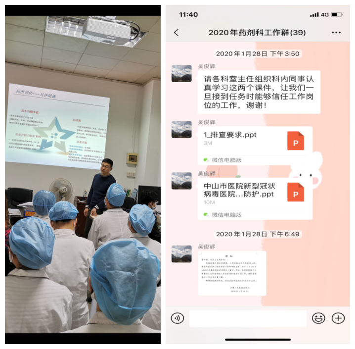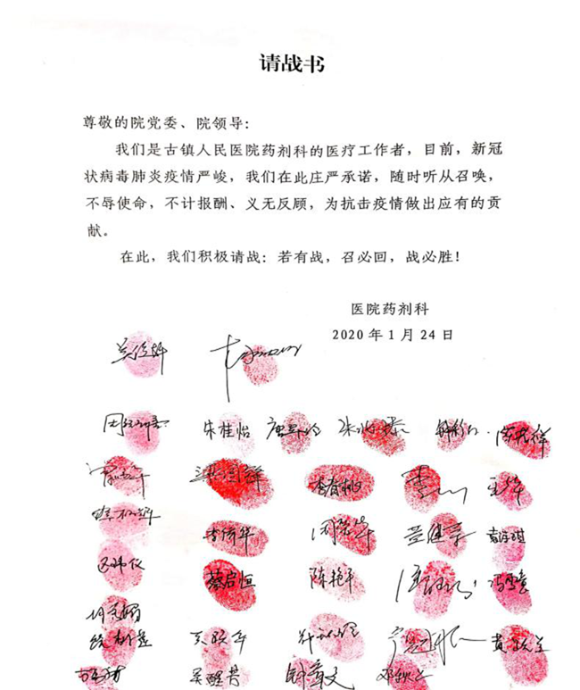 为了做好今次新型冠状病毒感染肺炎的防控工作,药剂科临床药学室吴俊辉主任从大年三十就一直坚守工作岗位,每天回院进行科室工作部署,兢兢业业,同时迅速组织全科人员进行相关知识培训,全面贯彻上级部门下达的决策部署,把防控疫情作为当前工作的头等大事,并要求科室人员做好自我防护;同事们积极响应,主动通过网络课程、视频学习、钉钉视频会议等多种形式进行学习。疫情爆发后,古镇镇各重要路口、车站均需要安排医务工作者共同参与排查工作,面对疫情,我们责无旁贷!在吴俊辉主任主动带领下,药剂科全体同事纷纷签署请战书,积极申请参与排查工作。