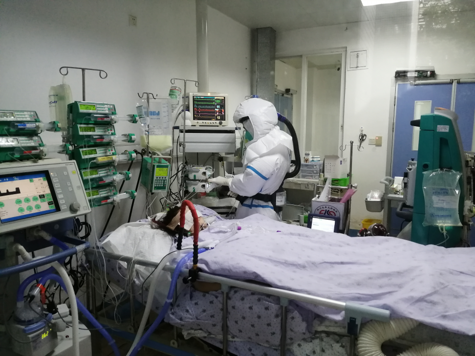 相对身体的不适,更痛苦的是精神压力。从医十余载,从未如此盯守病人,一刻也不能松懈,随时监测生命体征的变化、输液及各种微泵的情况,以及时报告二线及调整治疗。患者情况极不稳定,病情恶化,于2月6日上体外膜肺(ECMO)治疗,并派市人民医院的ECMO团队过来驻守指导治疗。使用ECMO后,监测更频密,血气、凝血功能、血常规等,几乎两至四个小时一次,就这样,两周过去了,病情仍无好转,焦虑、烦躁、失望、焦灼……