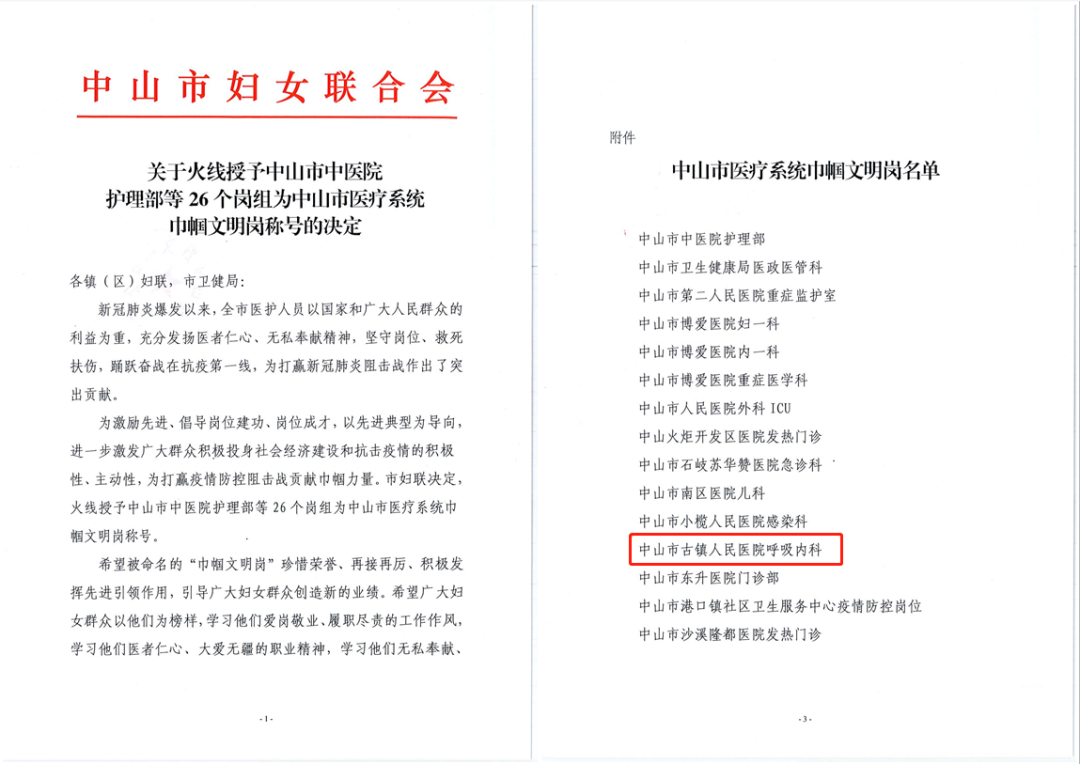 【巾帼力量】我院呼吸内科被火线授予中山市医疗系统“巾帼文明岗”称号