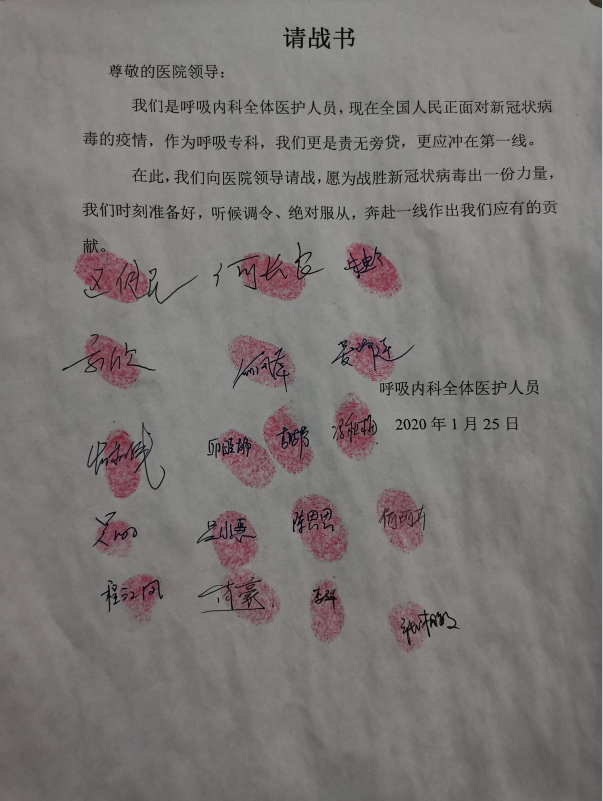 呼吸内科全体医务人员积极备战,纷纷取消春节休假,留守病房,随时待命,听从医院调遣。同时,科室全体医务人员在主任和护士长的带领下,严格做好疫情防控工作,纷纷申请加入抗击新冠病毒的医疗队伍,志愿坚守在疫情第一线,为保护人民健康贡献自己的一份力量,不计报酬,责无旁贷。