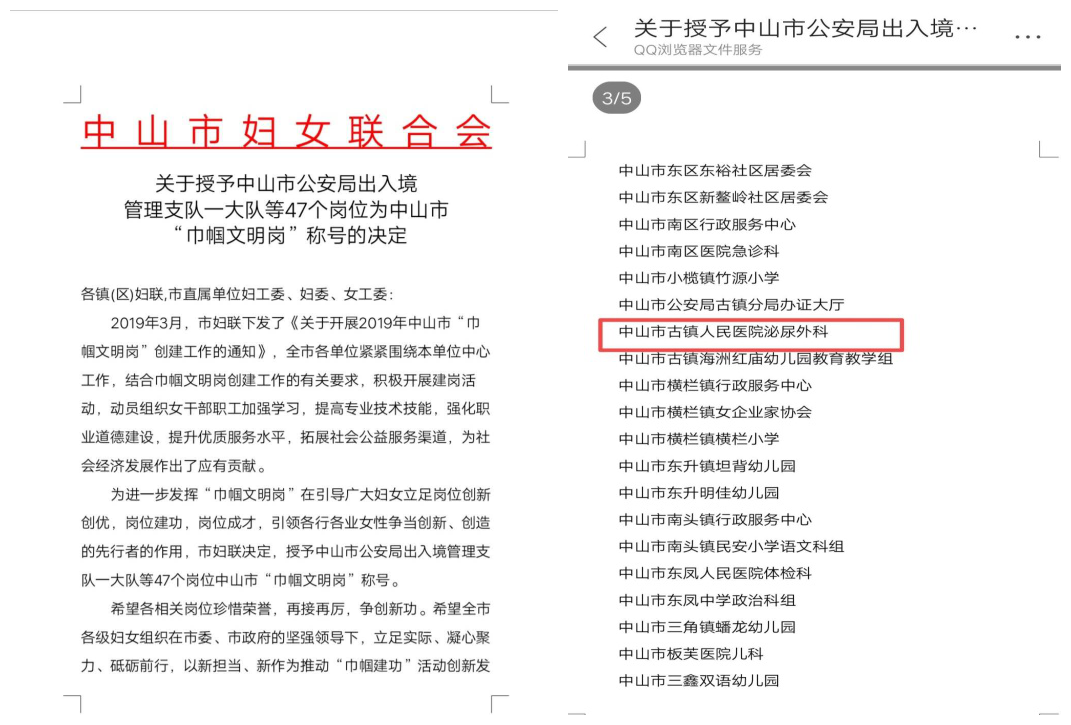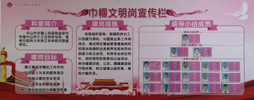 中山市古镇人民医院泌尿外科是中山市“十三五”特色专科,是南方医科大学珠江专科医疗联盟单位。自2019年3月以来,科室积极响应市妇联的政策,创建巾帼文明岗,通过建立创建团队,开展建岗活动,建立健全政治建设、业务工作、岗位服务、党风廉政等措施切实开展创建工作。